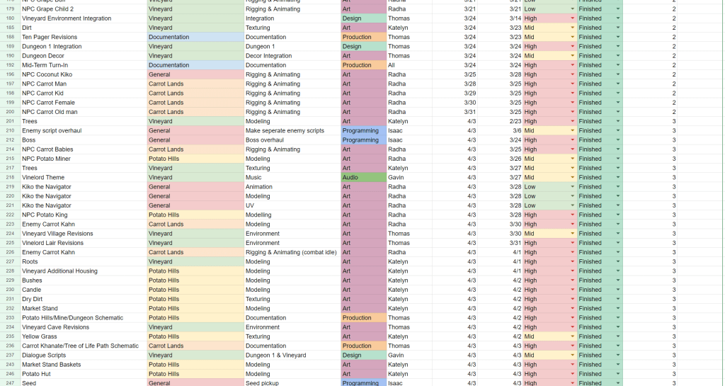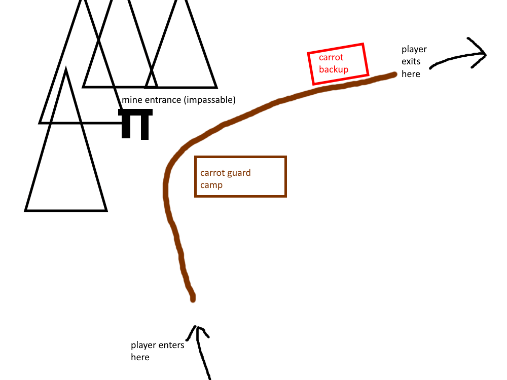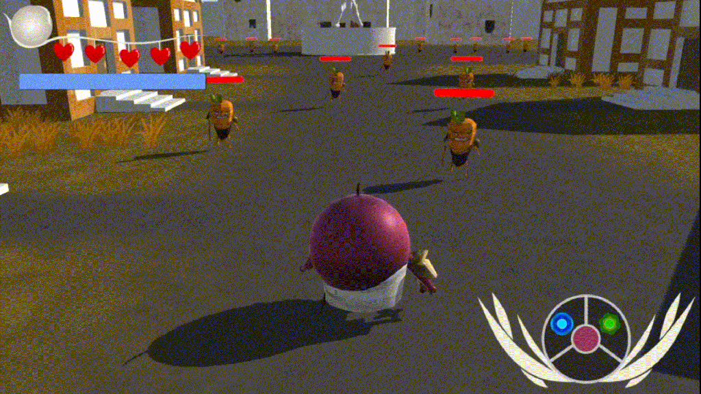 Narrative design was one of the tasks I took on due to personnel changes. Our capstone took place over the span of two semesters, and in between semesters, two students who handled production and narrative design graduated, leading to me assimilating both roles. The initial narrative featured several levels with two groups of antagonists, the Carrot Khanate and the Rot, zombified fruits and vegetables reanimated by an evil force.