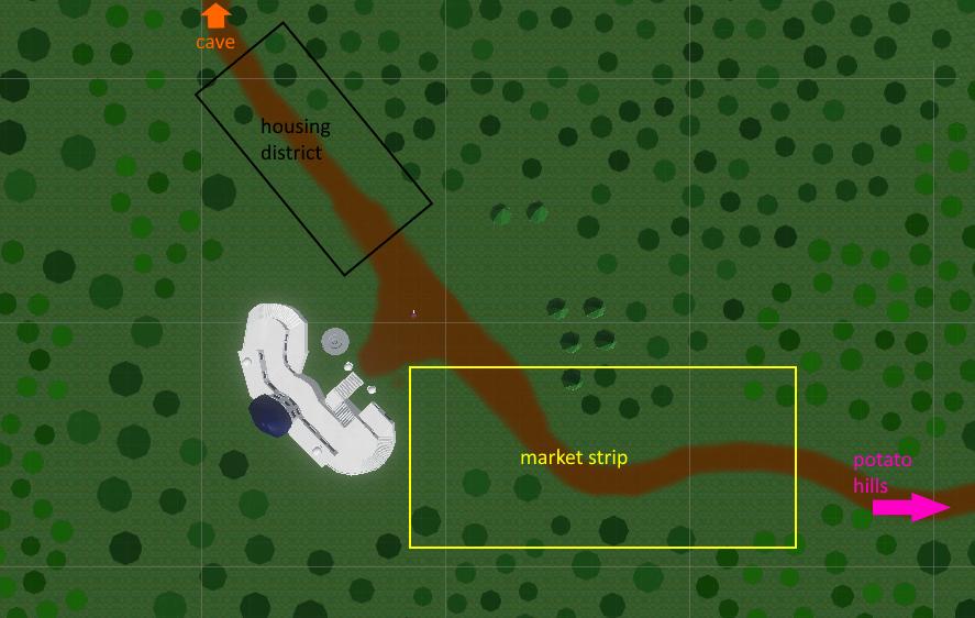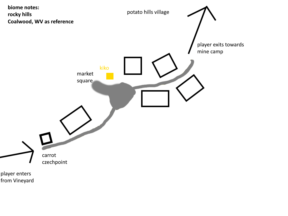 Open world areas featured NPCs for the player to interact with, as well as basic enemies. My favorite level to design was the second open-world level, the Potato Hills. I built it in three stages, starting with rough sketches of the main three pieces, then building out the terrain and placing enemies, and finally populating buildings, NPCs and foliage.