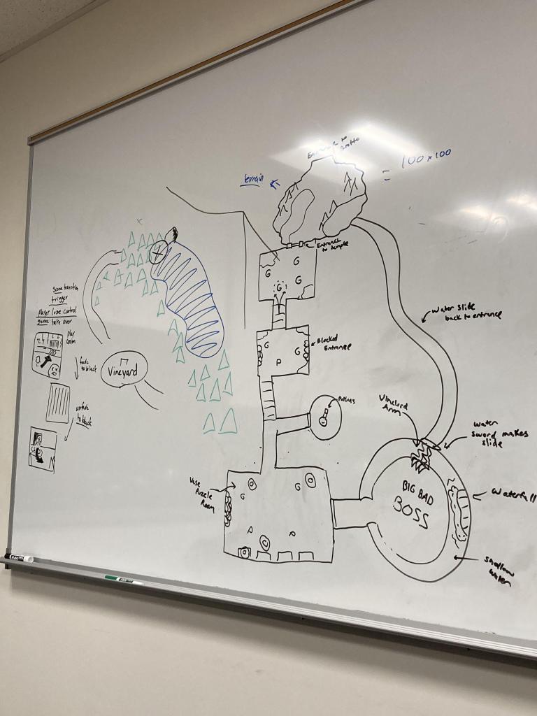 Dungeons were linear indoor areas for players to clear, populated by a mix of weak and middling enemies. Each dungeon featured a boss, and defeating that boss would yield a Power Seed that gave the player new elemental abilities. My favorite dungeon to design was the first dungeon, the Vine-Lord’s Lair. It underwent several iterations between first and second semester, but came together around the end of Spring Break.